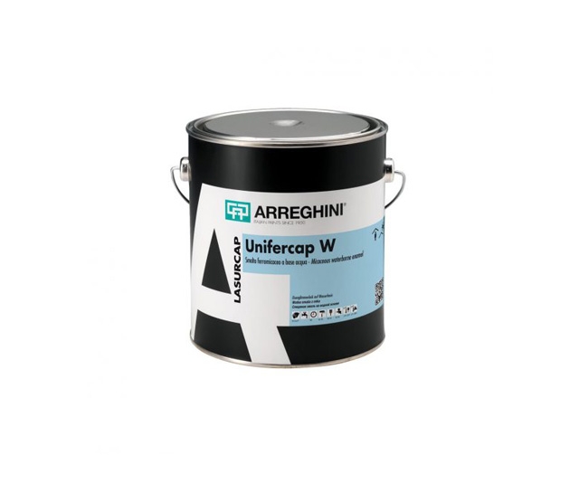 UNIFERCAP W водо-растворимая акрилово-алкидная эмаль на основе слюды молоткового железа. Подходит для окрашивания и защиты новых изделий и находящихся на стадии реставрации, таких как мебель для интерьера, дверей и окон, перил, решеток на основе железа, оцинкованного железа, алюминия, сплавов, пластмасс. Эмаль наносится непосредственно на изделие, без предварительного грунтования поверхности.